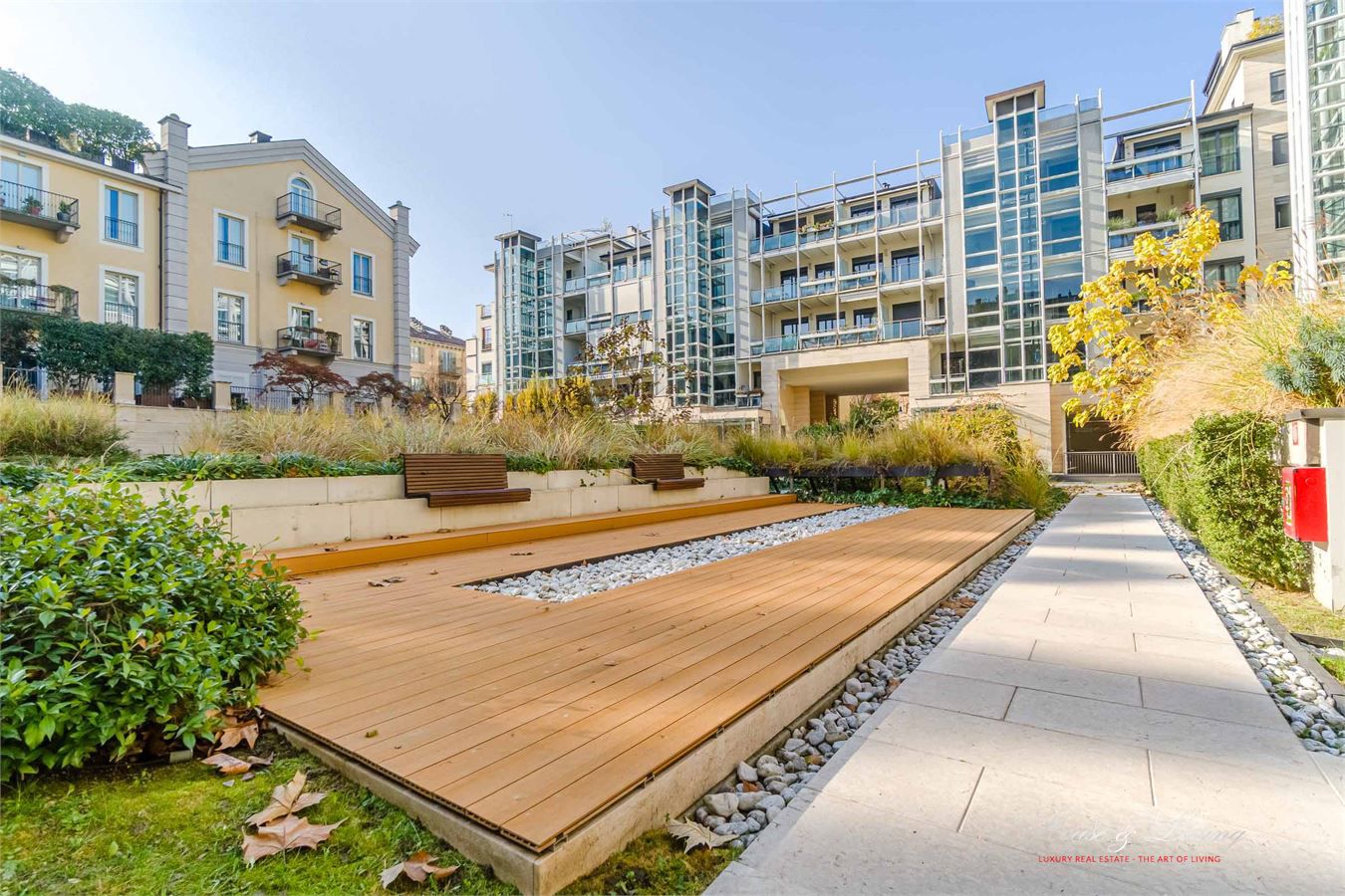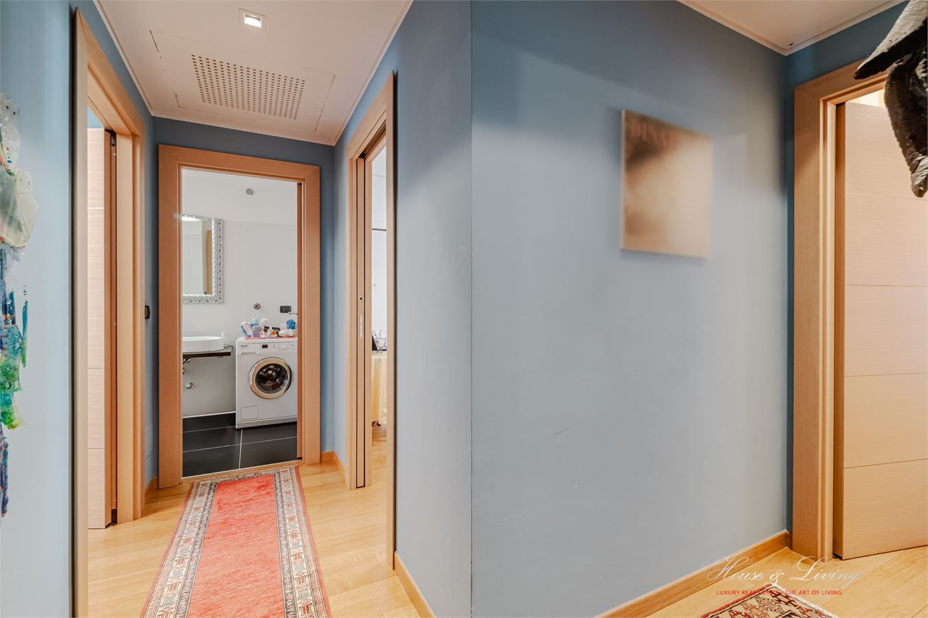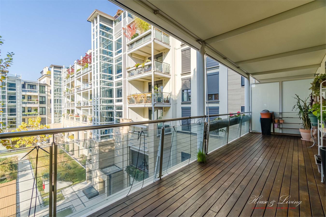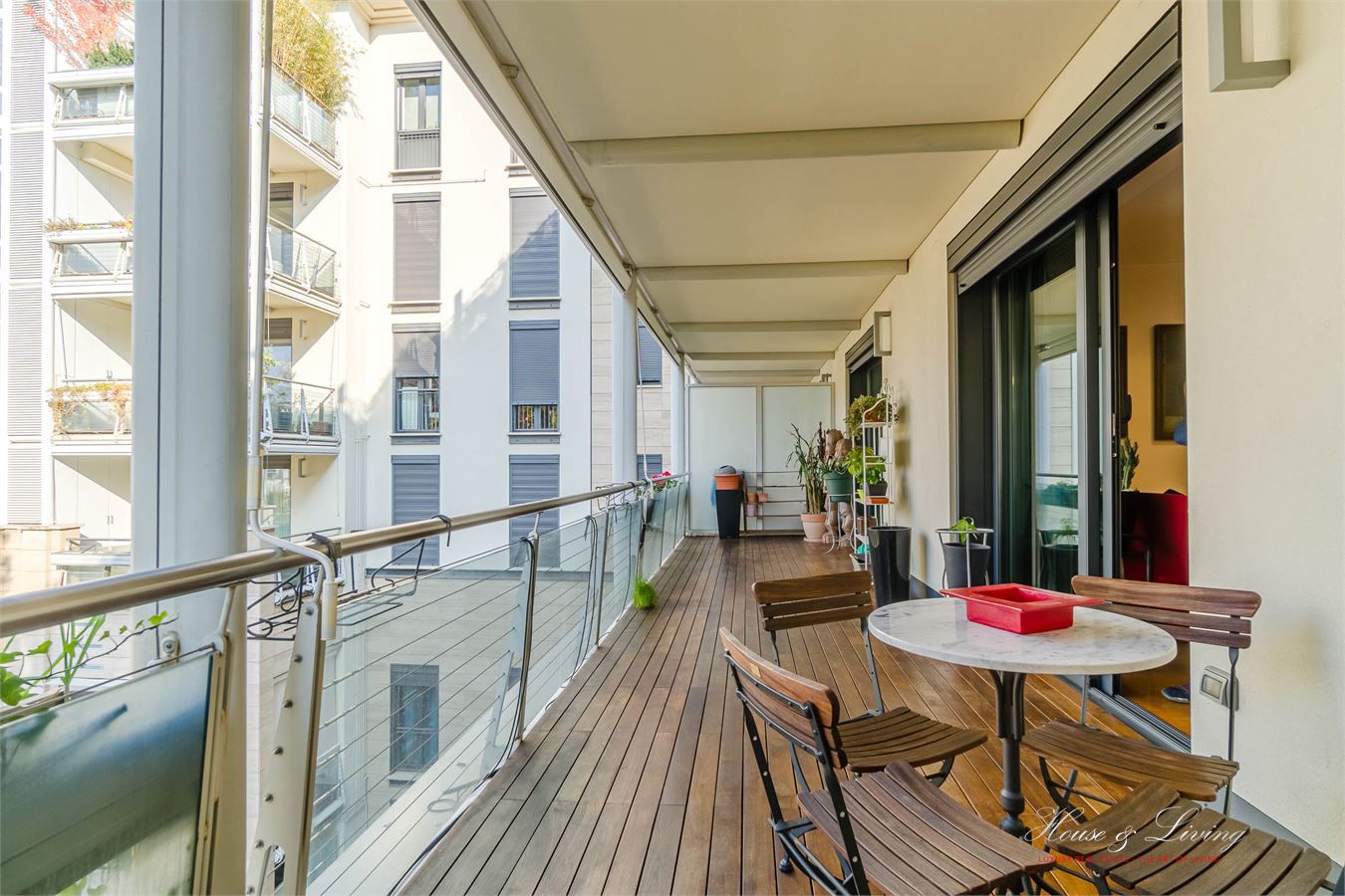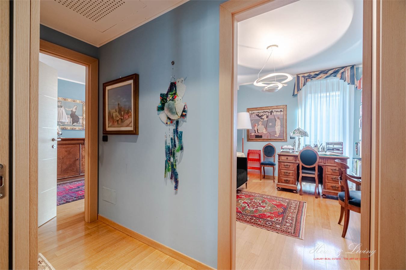 Dal salone, dalla cucina e dalla camera padronale si accede ad un terrazzo di circa 30 mq. con vista sulla corte interna/giardino condominiale, un ampio spazio verde perfettamente curato con fontane annesse (spazio in cui è consentito il gioco dei bambini).