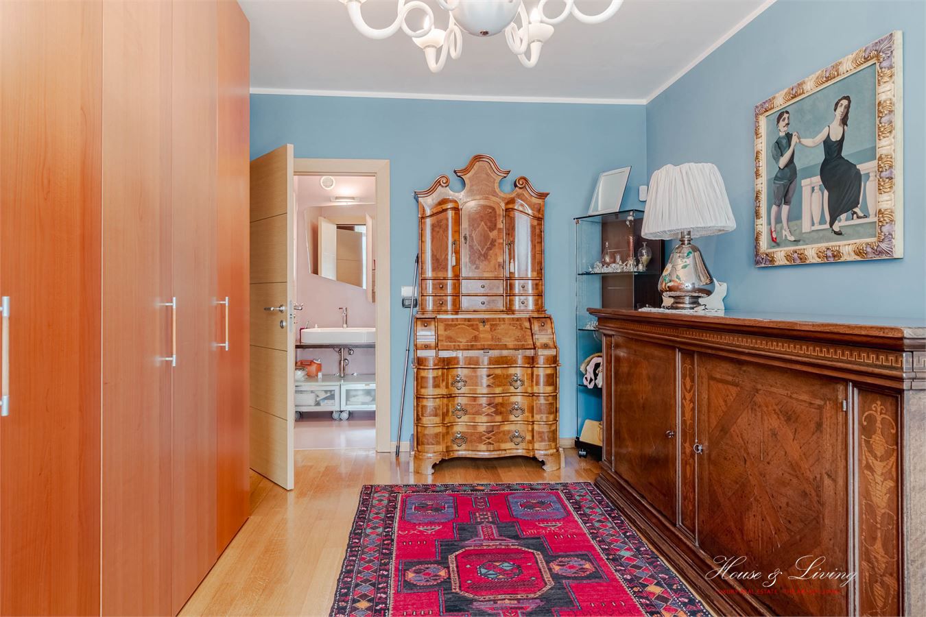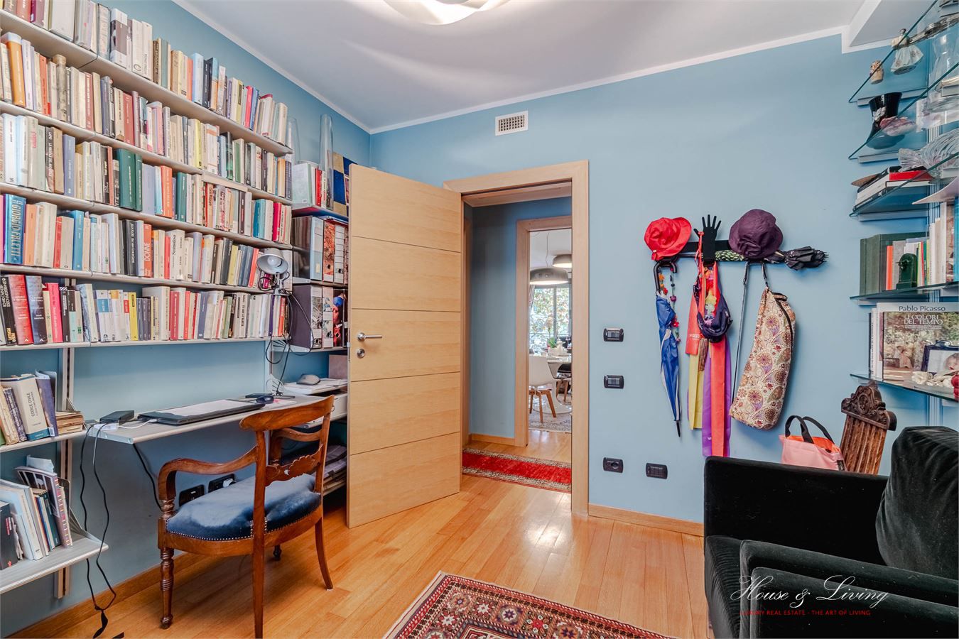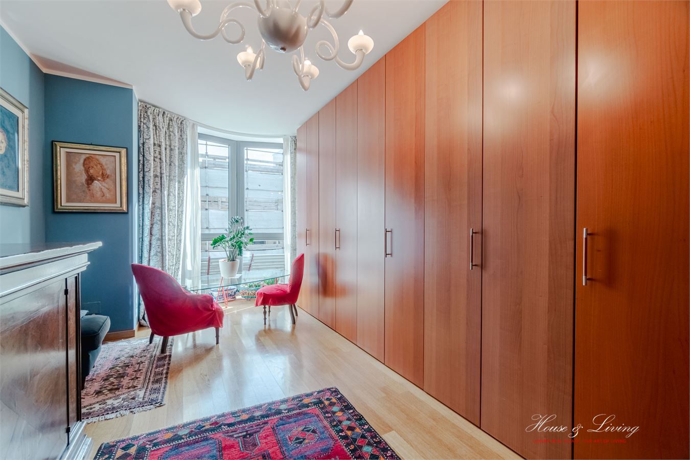 L'appartamento dispone inoltre di tre camere da letto (di cui una con bow window con vista su Via Moncalvo) e tre bagni.