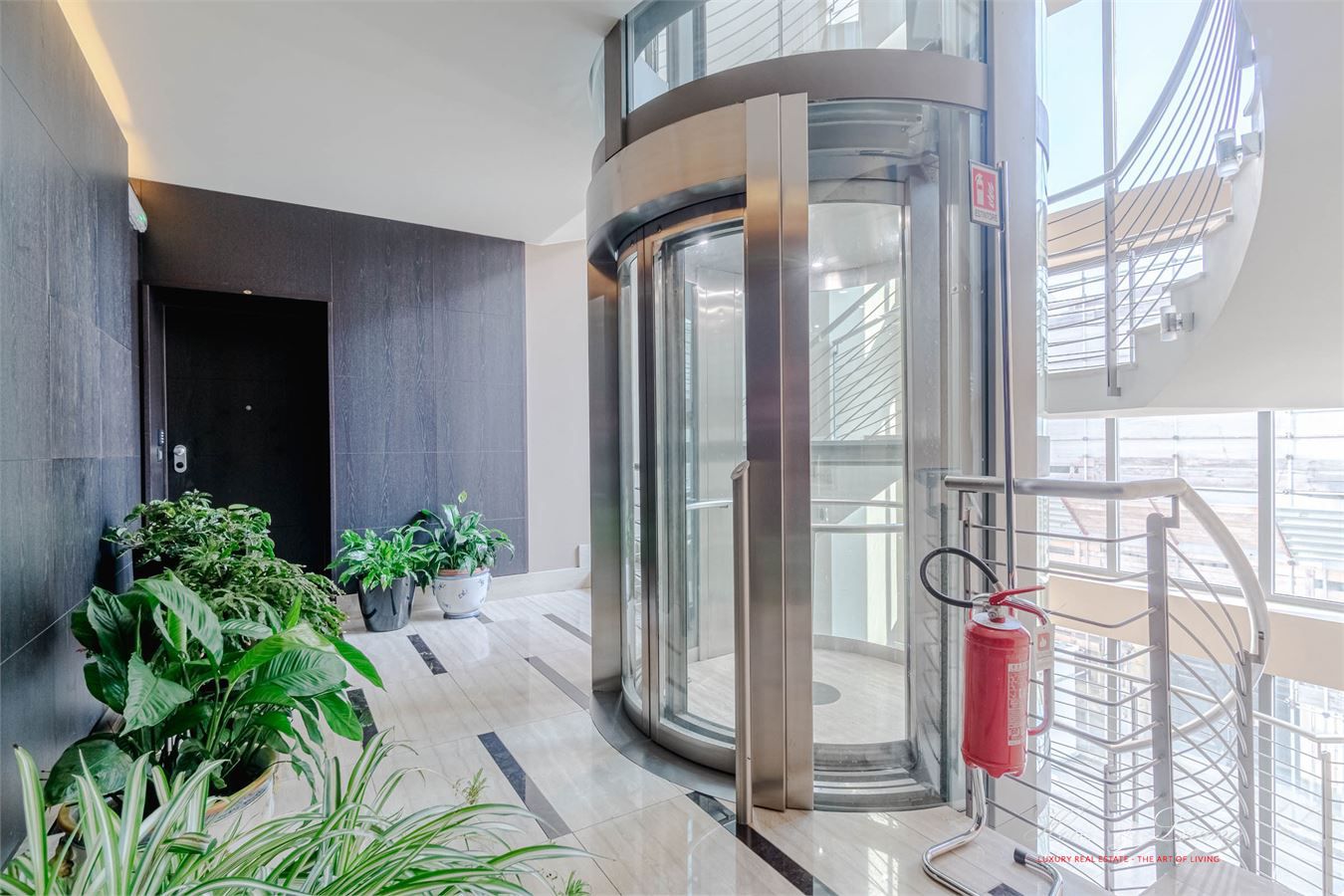 La facciata interna del complesso è caratterizzata dal vetro. Questo materiale conferisce un aspetto moderno e luminoso a tutto il contesto, compresi gli ascensori.